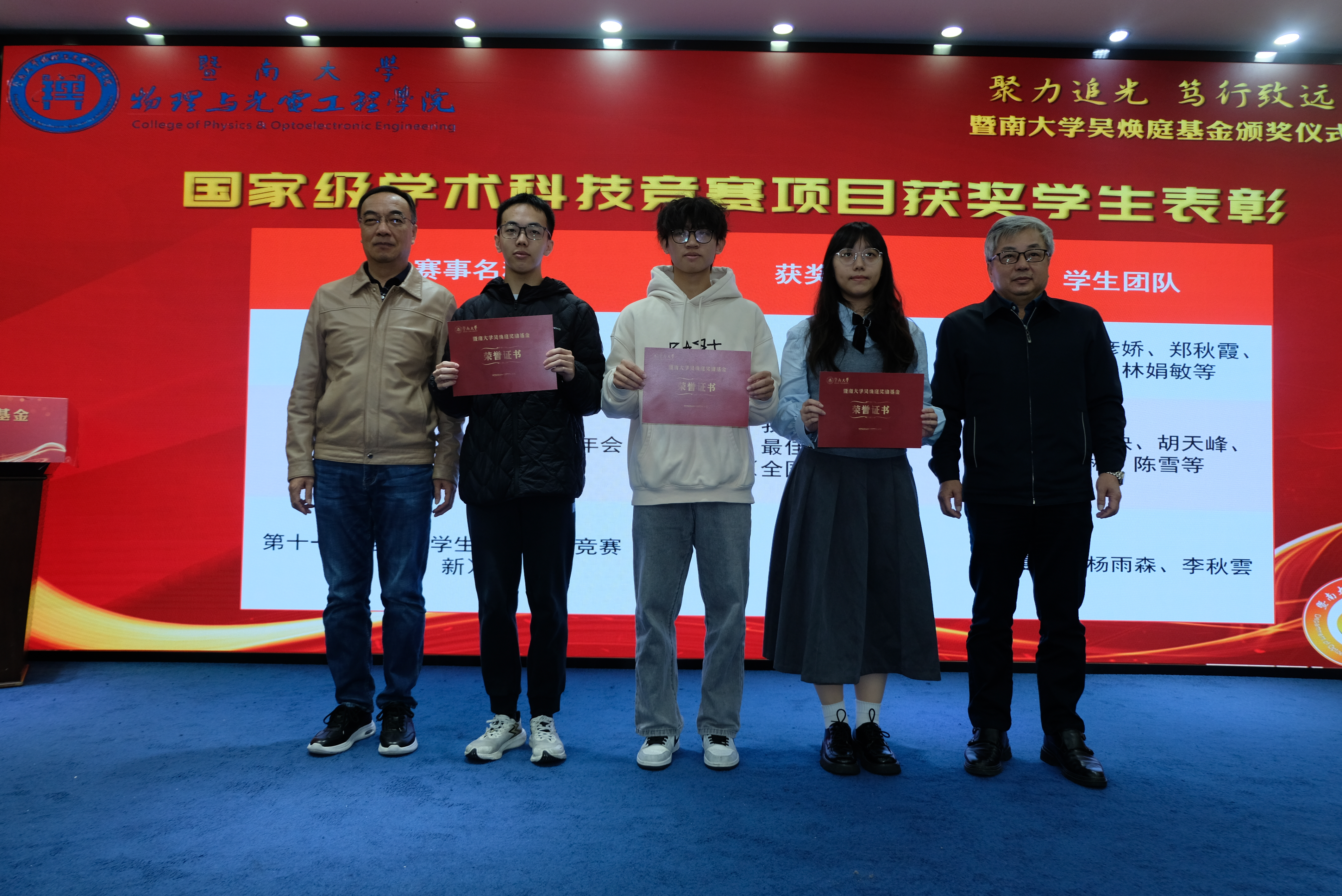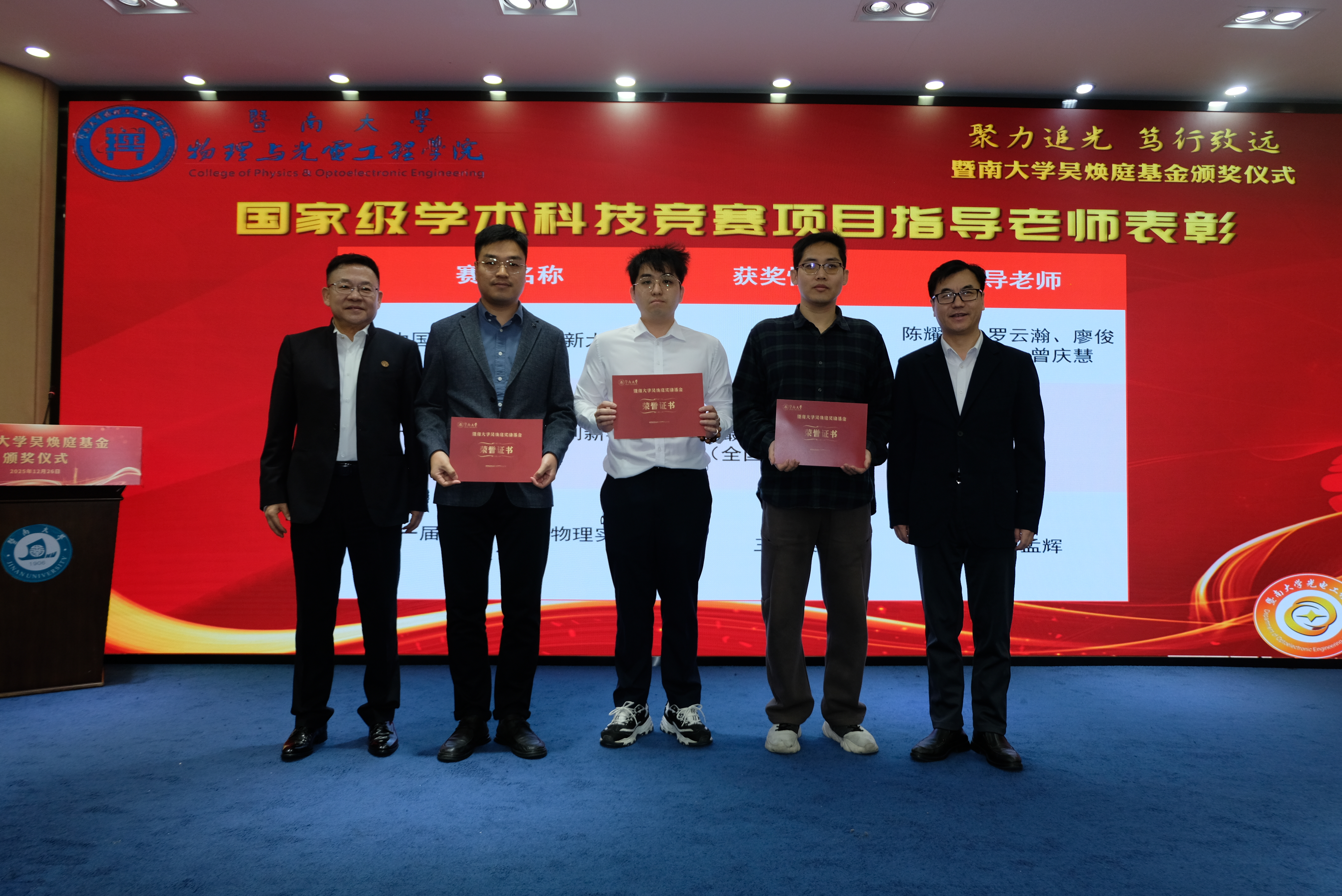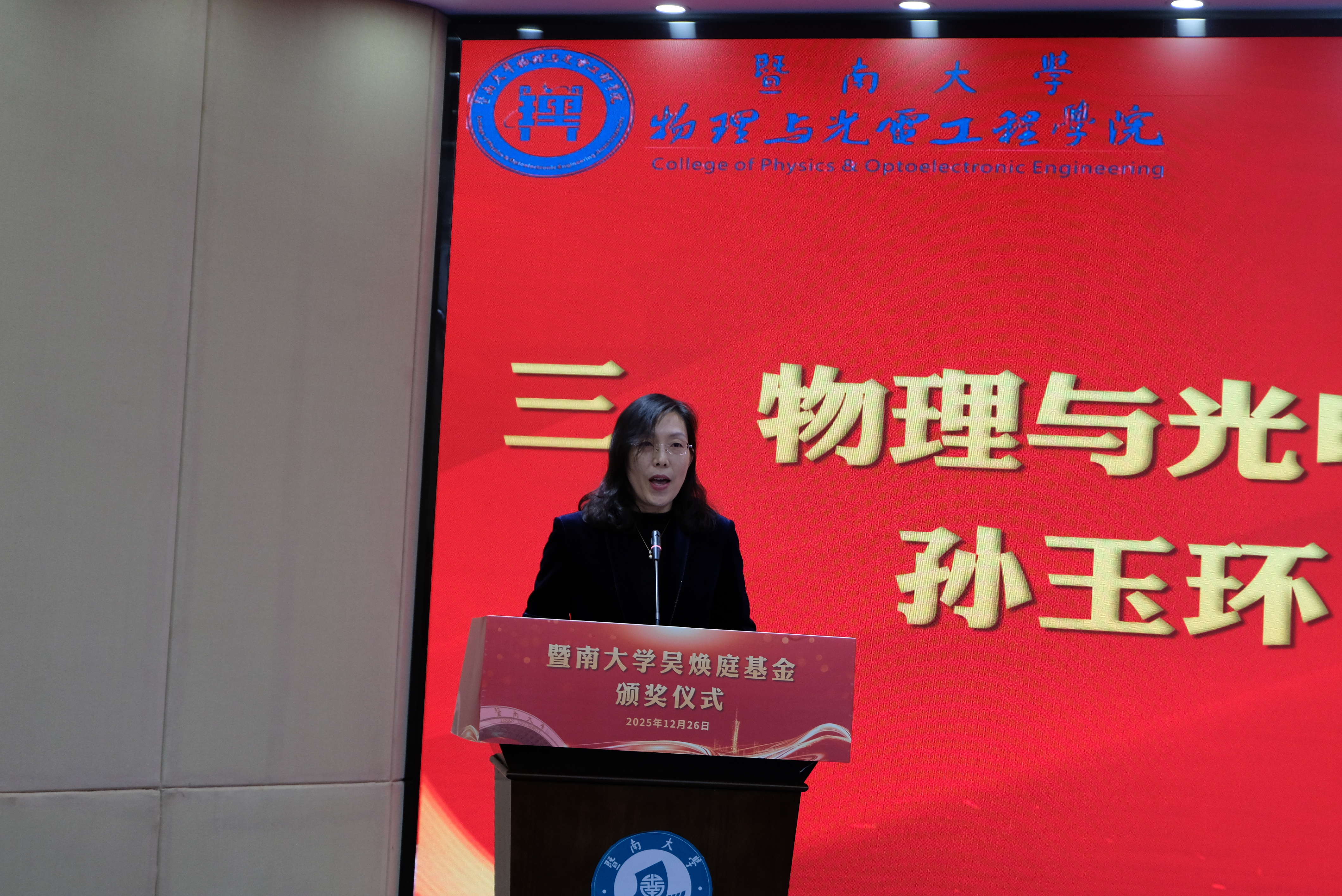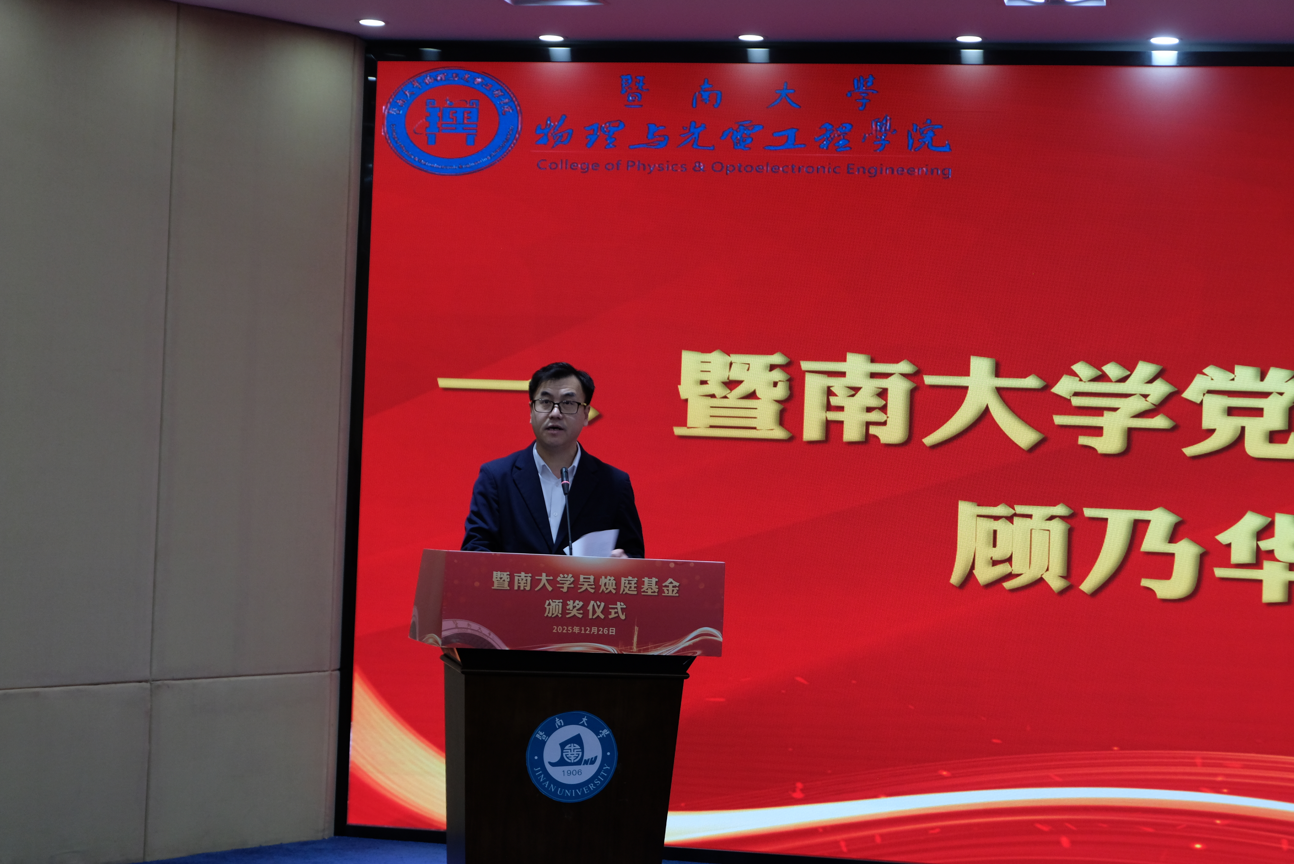 为表彰先进,进一步推动学校教育事业高质量发展,12月26日上午,暨南大学吴焕庭基金颁奖仪式在校友楼四楼会议室举行。暨南大学党委常委、副校长顾乃华,学校董事会董事吴闻杰,暨南大学对外联络处处长、教育发展基金会秘书长刘毓洁,物理与光电工程学院院长关柏鸥、党委书记黄睿、原院长陈振强、党委副书记孙玉环、副院长狄红卫,科技处副处长(挂职)陈耀飞,光电工程系主任卢惠辉、党总支书记曾庆慧、副主任代世波及师生代表等140余人出席仪式。仪式由曾庆慧主持。