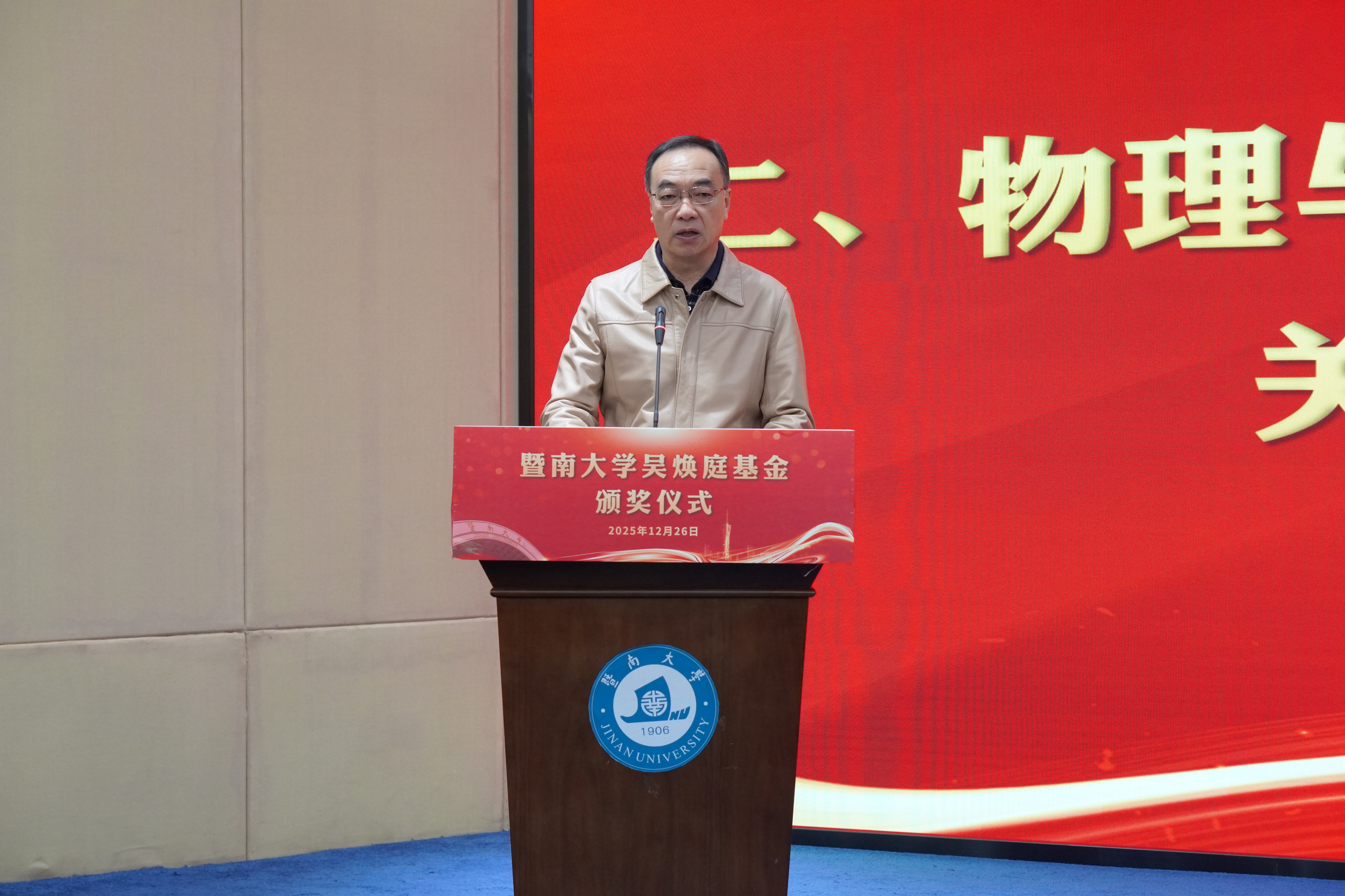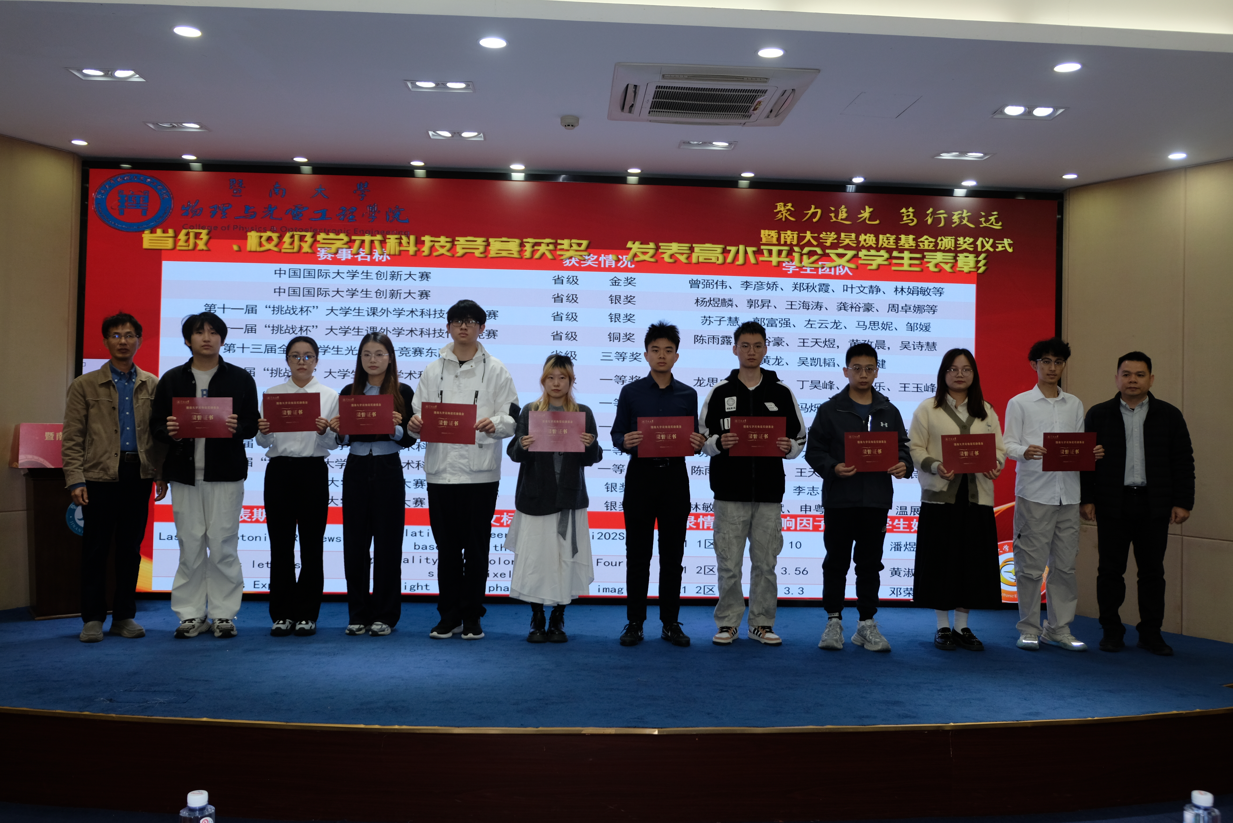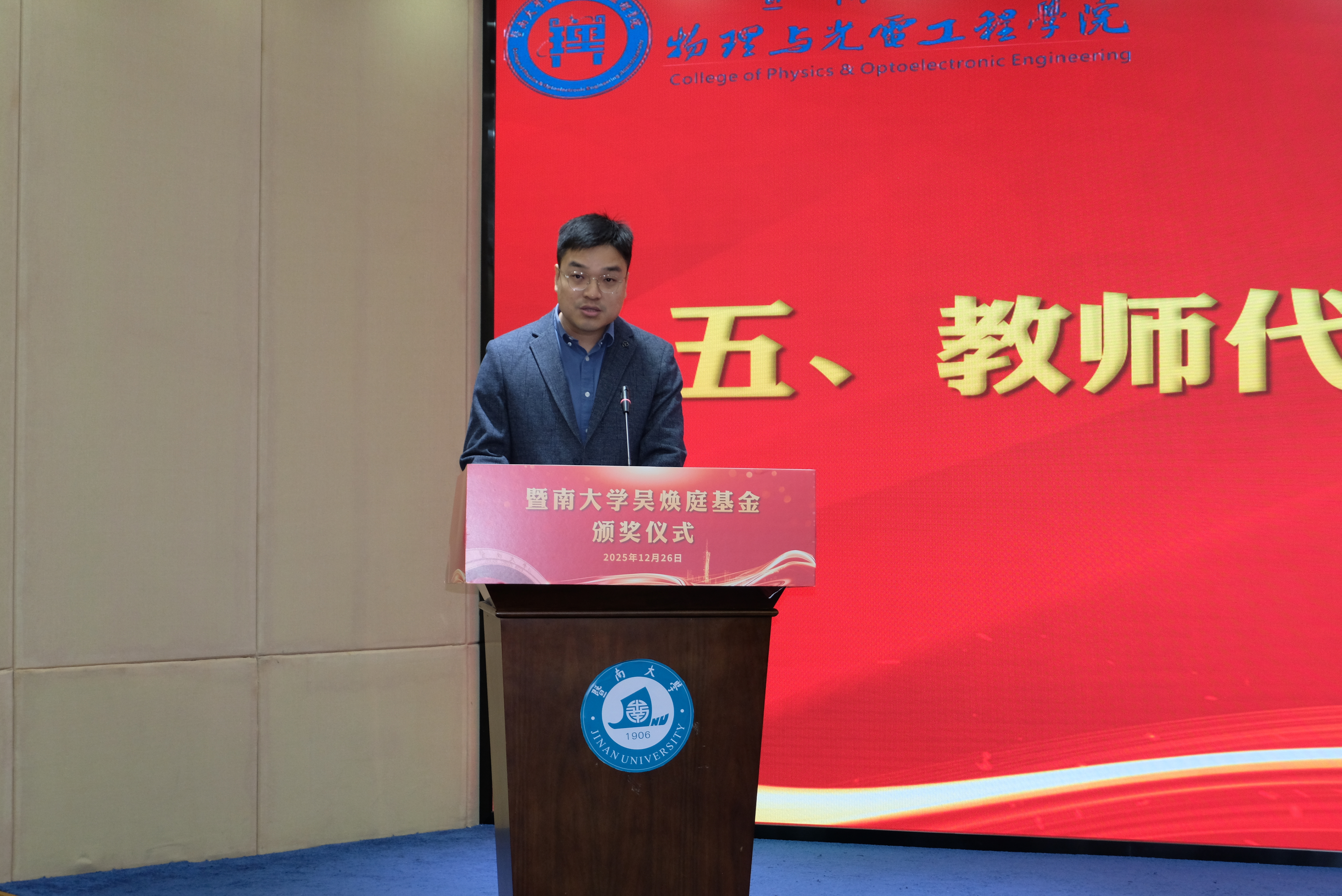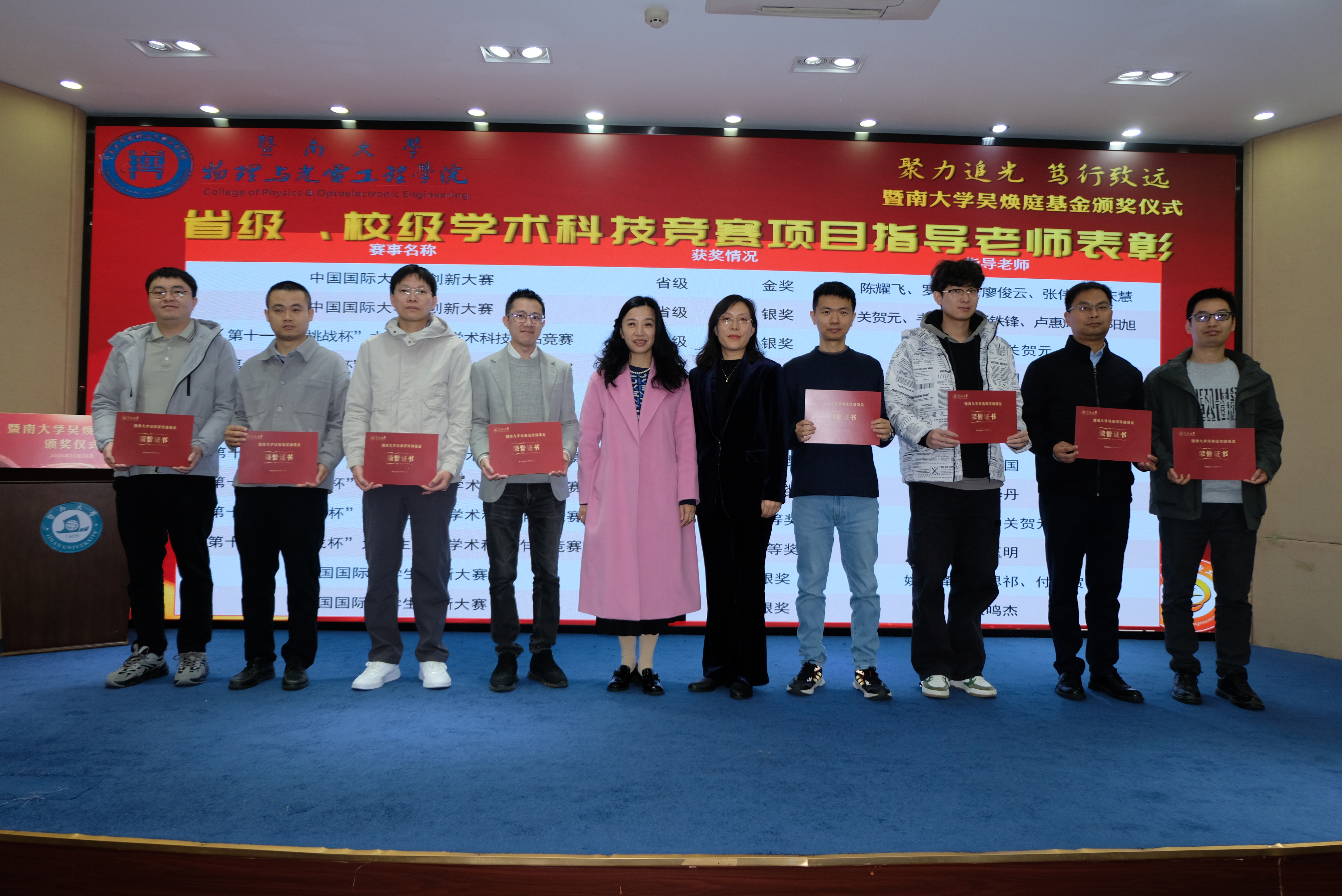 为表彰先进,进一步推动学校教育事业高质量发展,12月26日上午,暨南大学吴焕庭基金颁奖仪式在校友楼四楼会议室举行。暨南大学党委常委、副校长顾乃华,学校董事会董事吴闻杰,暨南大学对外联络处处长、教育发展基金会秘书长刘毓洁,物理与光电工程学院院长关柏鸥、党委书记黄睿、原院长陈振强、党委副书记孙玉环、副院长狄红卫,科技处副处长(挂职)陈耀飞,光电工程系主任卢惠辉、党总支书记曾庆慧、副主任代世波及师生代表等140余人出席仪式。仪式由曾庆慧主持。