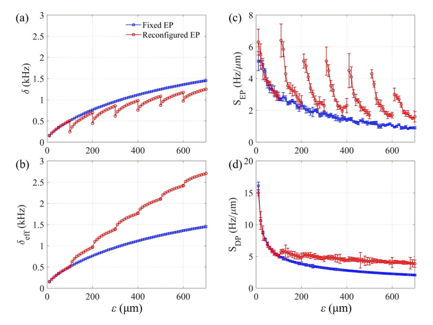 该团队提出了基于四波混频(FWM)机制的可重构奇异点(EP)传感方案,通过动态调节外部FWM注入信号,恢复系统的宇称时间反对称性与EP,从而实现传感的自适应。在传感器与磁靶标600μm范围内的轴向位移扰动情况下,可重构EP能够保持高灵敏度,最高比传统的固定EP方案提高3.5倍,适用于大动态范围的高精度测量。此项研究为高精度计量领域的自适应传感器开发提供了灵活的框架,能够有效推动下一代高精密传感技术的发展。